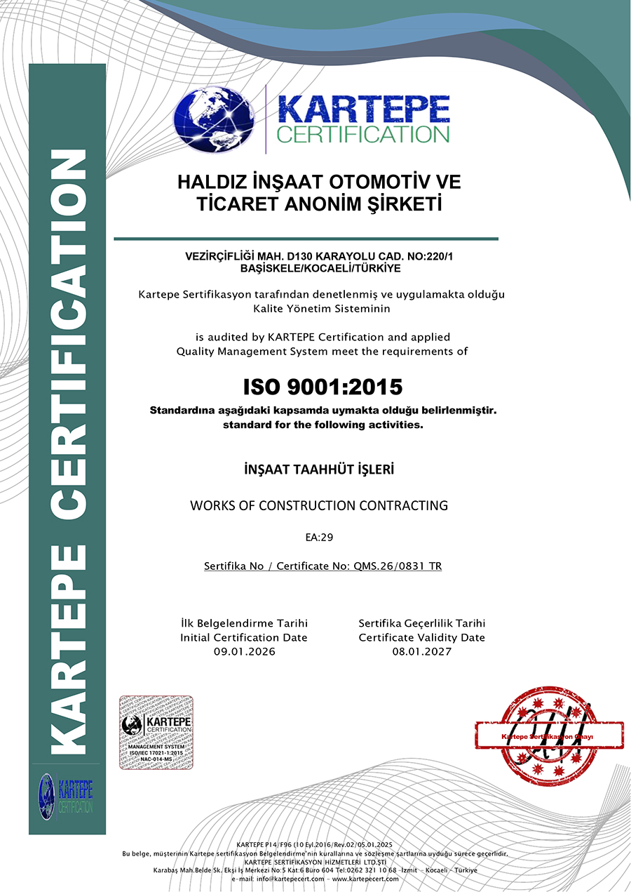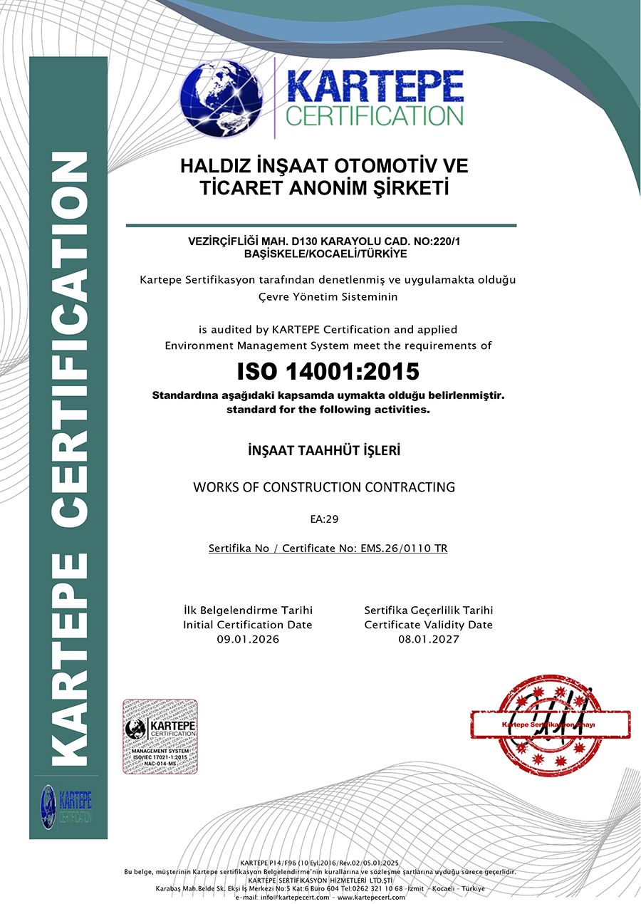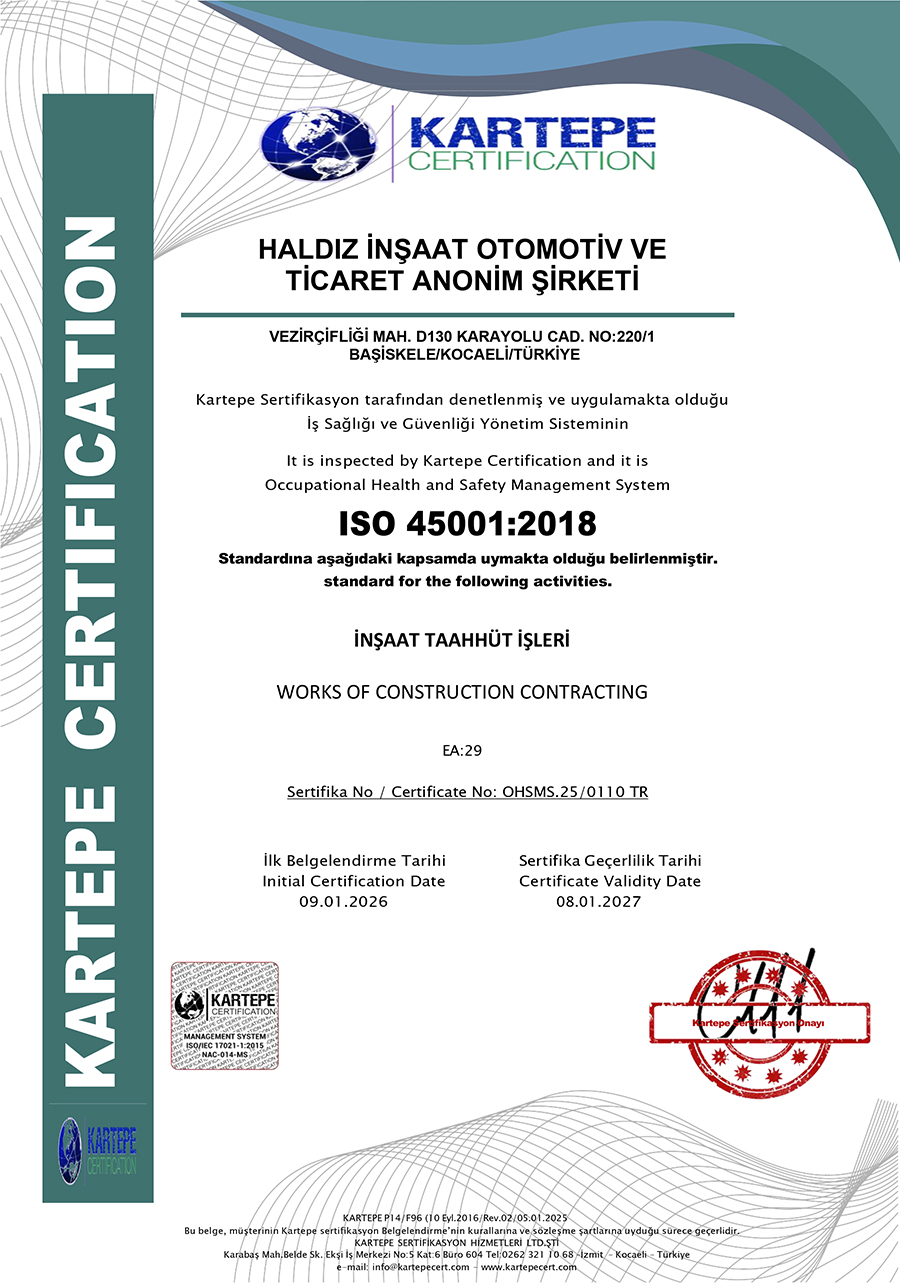 As a result of TRB audits, Haldız Construction was awarded the certificates of ISO9001 Quality Management Systems, ISO14001 Environmental Management Systems, ISO45001 Occupational Health and Safety Management Systems.